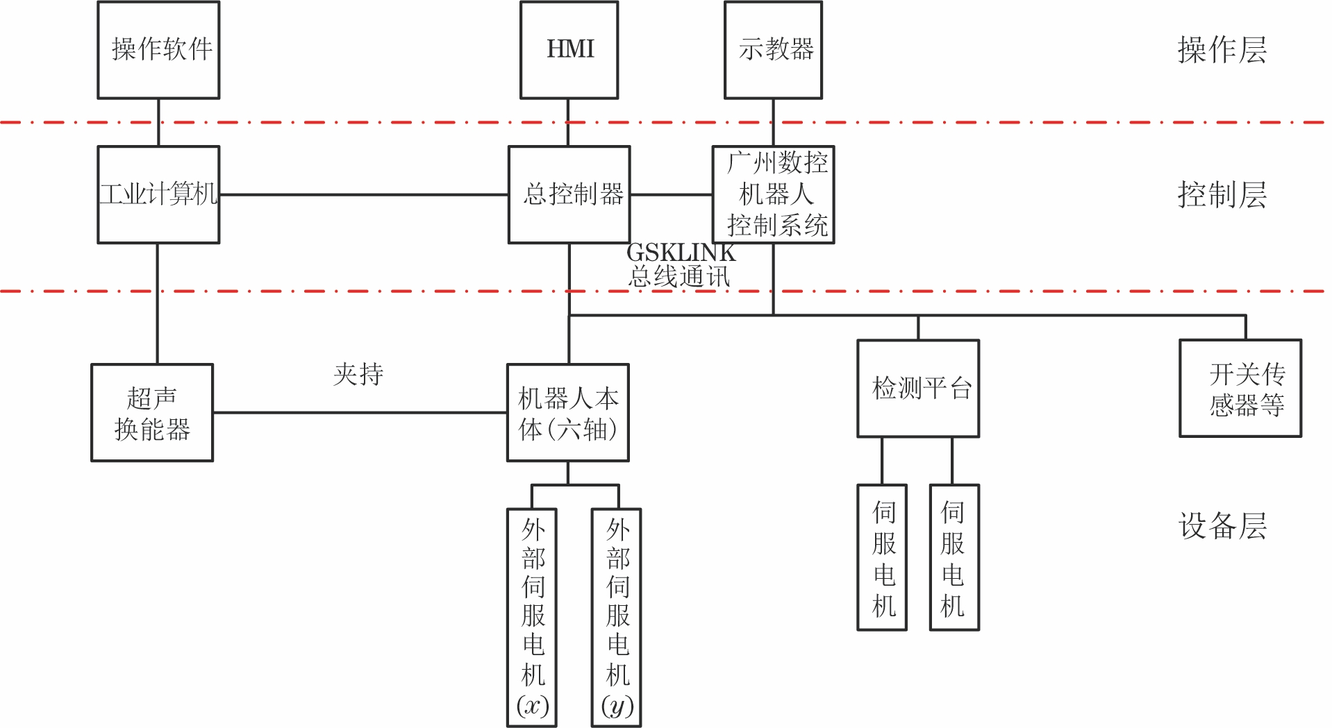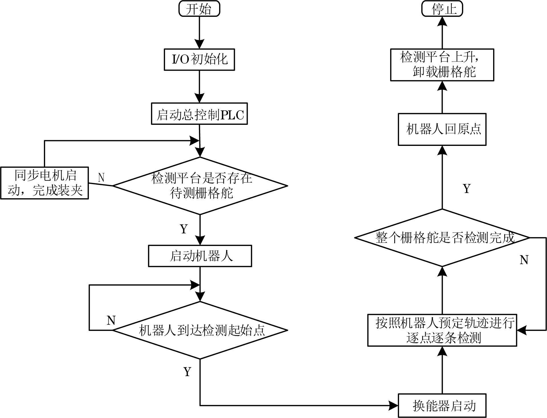 • 摘要: 针对栅格舵焊缝的超声无损检测需求,为解决当前人工手动扫查检测及缺陷评定中的可靠性低、周期长和系统成熟度低等问题,在阵列超声主机、换能器及成像软件的开发基础上研制了一种适用于栅格舵焊缝超声检测的装置。该装置以PLC(可编程逻辑控制器)为控制核心,采用GSKLink通讯协议实现对于机器人、伺服电机的控制,同时根据栅格舵焊缝结构设计自动化工艺运动流程,实现目标的自动化检测。通过实际运行该装置并将其应用于生产,证明了该装置能够满足栅格舵焊缝的自动超声检测需求,大大提高了栅格舵的生产效率。