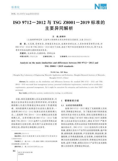 Abstract : Ananal y sisonthesimilaritiesanddifferencesbetweenthestandardISO 9712-2012and TSG