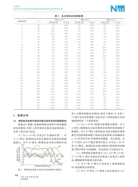 于 45° 探头, 根部钝边未熔合模拟反射体的回波幅 α=84° 时有些升高, 但整体回波幅值一直比较低。对