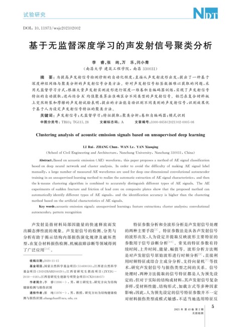 关键词:声发射信号; 无监督学习; 特征提取; 聚类分析; 卷积自编码器; 模式识别