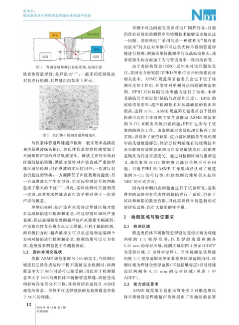 而双侧扫查时, 超声波探头可以从近端和远端两个 锻造奥氏体不锈钢管道焊缝的受检区域为焊缝