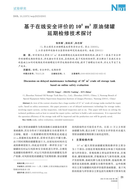 成检修难度较大, 因此迫切需要一种评价方法 [ 1 ] 对 10 m 超大型原油储罐延期检修评价主要分