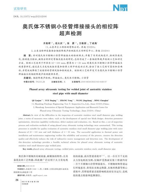关键词:相控阵超声检测;焊接接头;奥氏体不锈钢;小径管