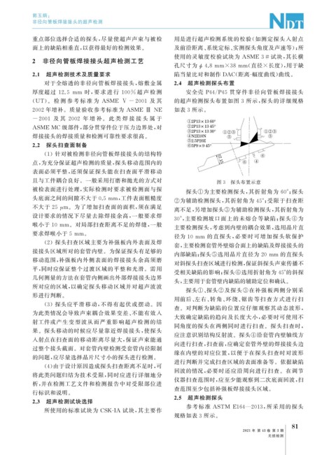 ( UT )。 检 测 参 考 标 准 为 ASME Ⅴ -2001 及 其 的超声检测探头布置如图 3 所示, 探头的详细规格