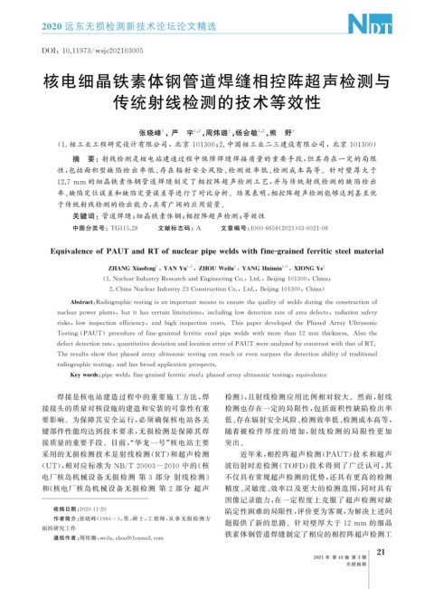 E q uivalenceofPAUTandRTofnuclear p i p eweldswithfine- g rainedferriticsteelmaterial