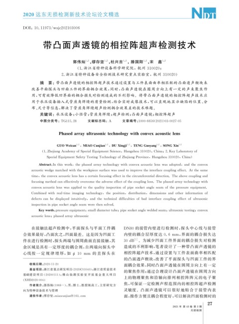 关键词:承压设备; 小径管; 管座角焊缝; 超声检测; 凸面声透镜; 相控阵超声