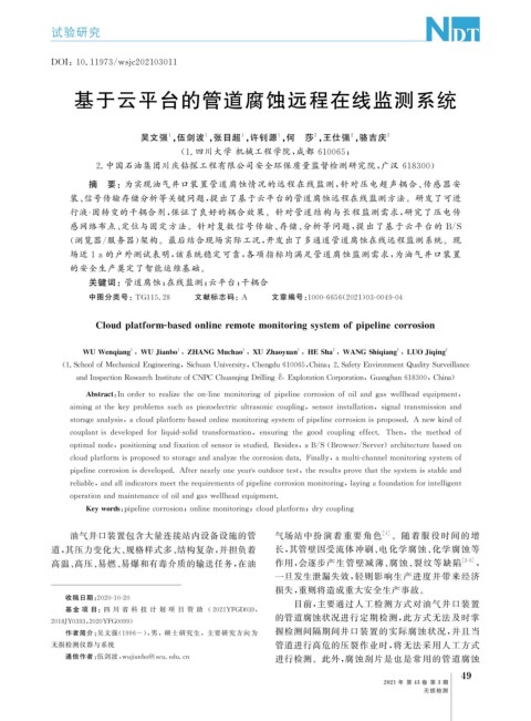 Ke ywords : p i p elinecorrosion ; onlinemonitorin g ; cloudp latform ; dr y cou p lin g