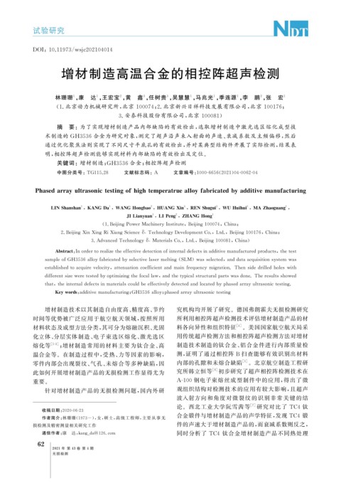 关键词:增材制造; GH3536 合金; 相控阵超声检测