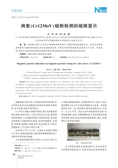 摘 要:某阀套( 材料 Cr12MoV ) 的磁粉检测过程中, 内壁出现线性磁痕显示。经过荧光渗透