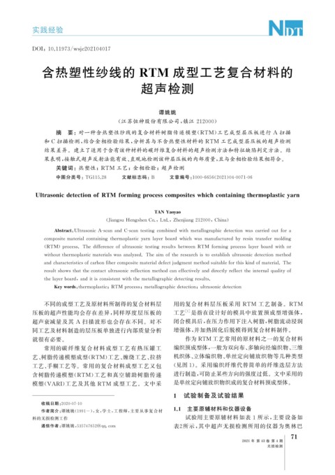 和 C 扫描检测, 结合金相检验结果, 分析其与不含热塑性材料的 RTM 工艺成型层压板的超声检测