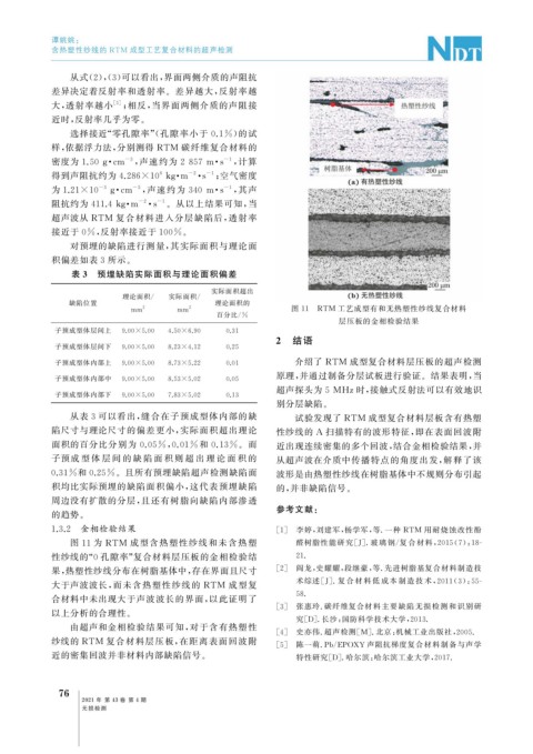 从表 3 可以看出, 缝合在子预成型体内部的缺 试验发现了 RTM 成型复合材料层板含有热塑