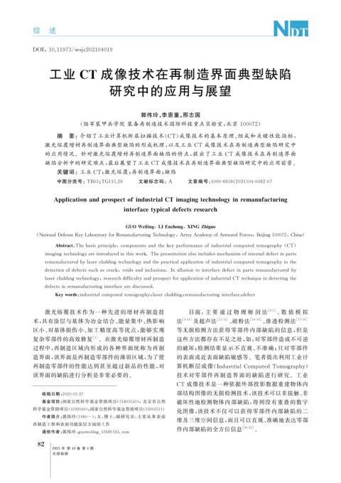 的应用情况。针对激光熔覆增材再制造界面缺陷的特点, 提出了工业 CT 成像技术在再制造界面