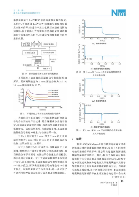 对比分析图 22 , 23 可以看出, 当缺陷位于上表 涡流效应时的脉冲漏磁检测模型, 分析了不同参数