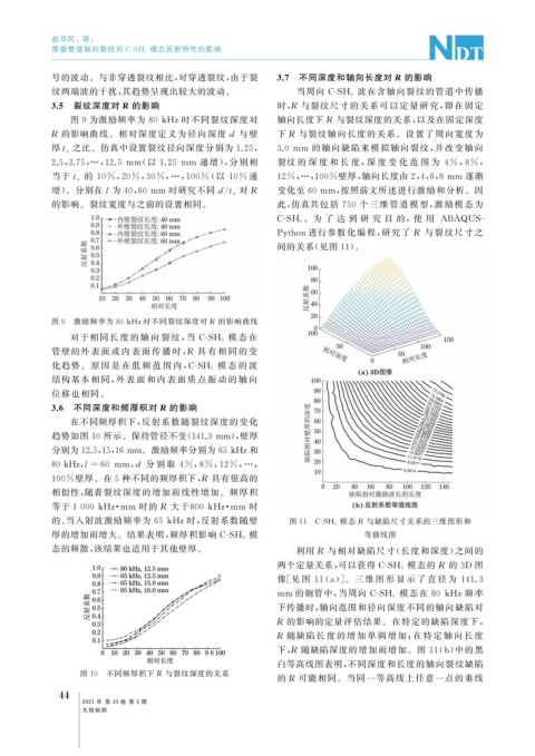 号的波动。与非穿透裂纹相比, 对穿透裂纹, 由于裂 3.7 不同深度和轴向长度对 R 的影响