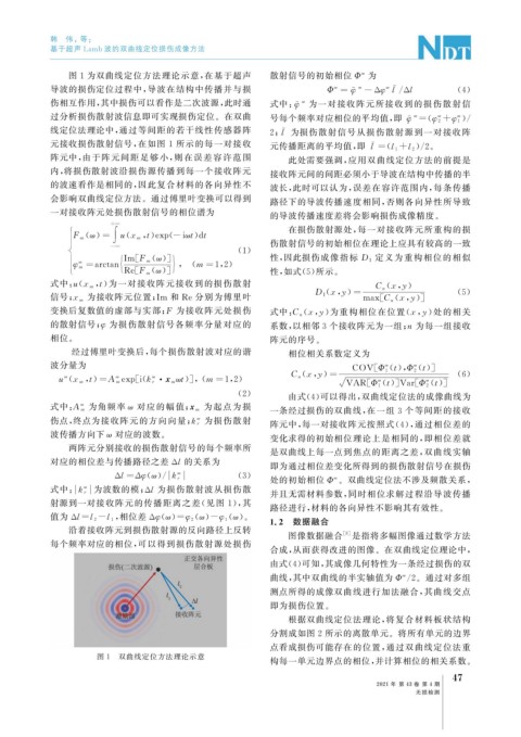 元接收损伤散射信号, 在如图 1 所示的每一对接收 元传播距离的平均值, 即 l = ( l 1+ l 2 2 。