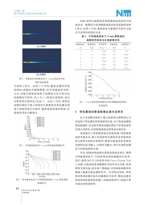 计算壁厚反演误差( 见表 3 )。由表 3 可知, 利用无 图 9 9mm 厚管道的晚期信号斜率随提离高度的