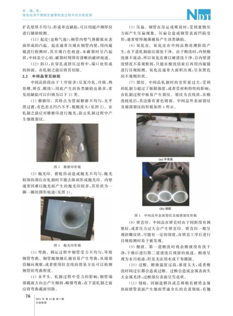 ( 1 )修磨印。其特点为管面修磨不均匀, 无平 洗钝化后, 其边缘有黄色锈斑。中间品外表面裂纹