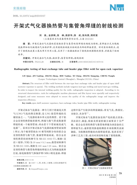关键词:开架式海水气化器; 换热管; 集管角焊缝; 射线检测