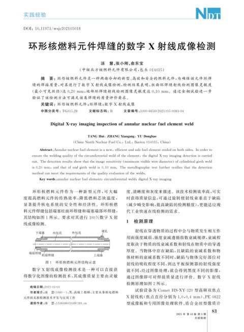 关键词:环形核燃料元件; 环焊缝; 数字 X 射线成像