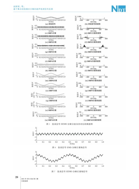 赵斯琪, 等: 基于集合经验模态分解的超声检测信号处理 图 5 仿真信号 EEMD 分解分量及其对应的频谱图 图 6 仿真信号 EMD 分解后重构信号 图 7 仿真信号 EEMD 分解后重构信号 2 0 2021 年 第 43 卷 第 5 期 无损检测