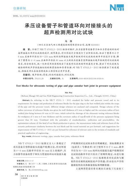 关键词:超声检测; 管道; 环向对接接头; 对比试块