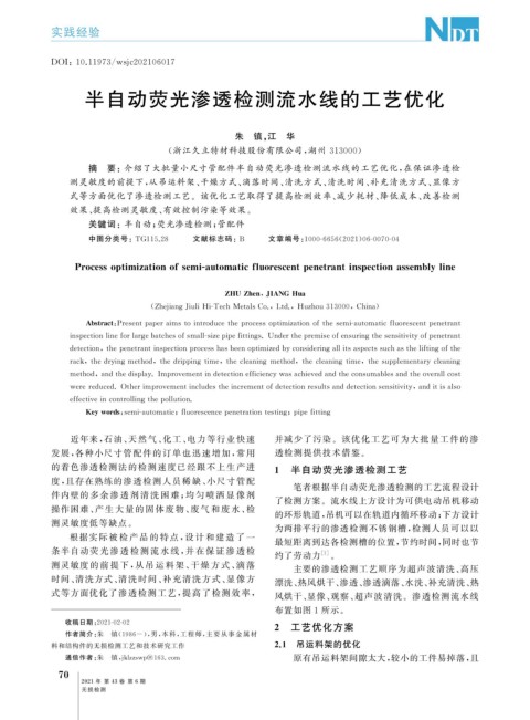 摘 要:介绍了大批量小尺寸管配件半自动荧光渗透检测流水线的工艺优化, 在保证渗透检