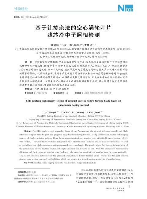 试样和叶片对比试样, 使用冷中子源和单面乳化胶片的成像方式, 研究了 Gd 2O 3