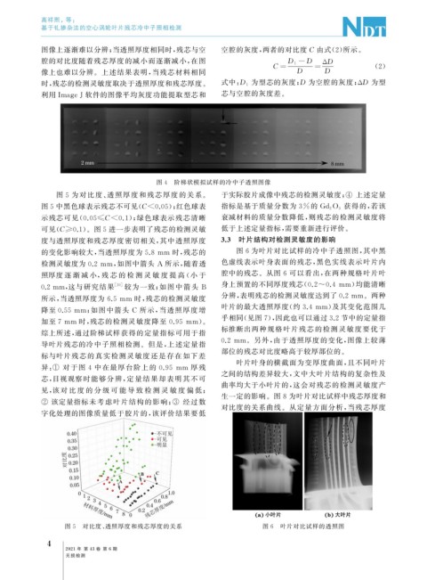 照厚度 逐 渐 减 小, 残 芯 的 检 测 灵 敏 度 提 高 ( 小 于 腔中的残芯。从图 6 可以看出, 在两种规格叶片叶