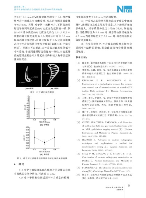 如, 小叶片中残芯的对比度变化约为 0.8 , 大叶片中 芯, 当透照厚度为 5.8mm 时, 残芯的检测灵敏度为
