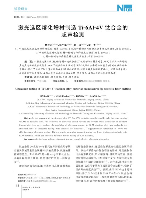 通信作者: 林立志, linlizhi19872006@163.com 须针对 SLM 制件的特殊性开展无损检测研究 [ 6 ] 。