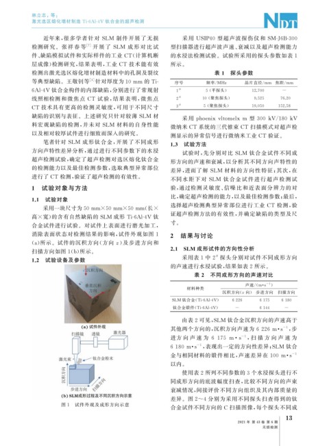 检测研 究。张 祥 春 等 [ 7 ] 开 展 了 SLM 成 形 对 比 试 型扫描器进行超声波声速、 衰减以及超声检测能力