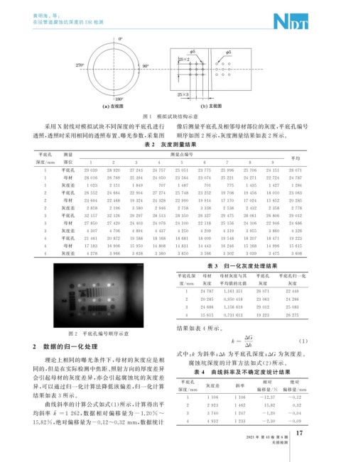 采用 X 射线对模拟试块不同深度的平底孔进行 像后测量平底孔及相邻母材部位的灰度, 平底孔编号