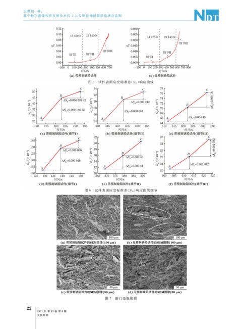 王恩和, 等: 基于数字图像和声发射技术的 4130X 钢拉伸断裂损伤状态监测 图 5 试件表面应变标准差( S D 响应曲线 ) 图 6 试件表面应变标准差( S D 响应曲线细节 ) 图 7 断口微观形貌 2 2 2021 年 第 43 卷 第 6 期 无损检测