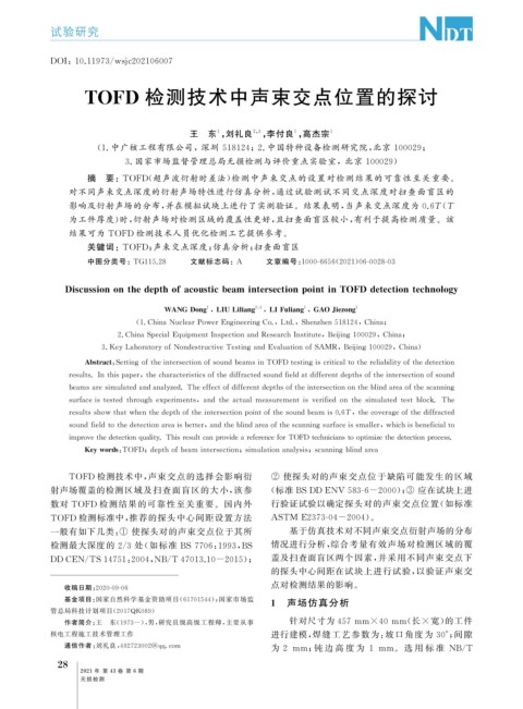关键词: TOFD ; 声束交点深度; 仿真分析; 扫查面盲区