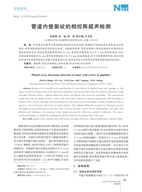 理论, 使用相控阵超声技术对其进行检测。试验结果表明, 管道内壁微小裂纹的高度与反射回波的