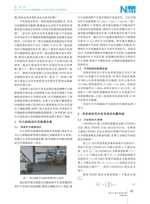 研究。 JOOSSE 等 [ 4 ] 指出高幅值和高能量的声发射 长度为 50mm 的叶片分层缺陷。调节液压激振式