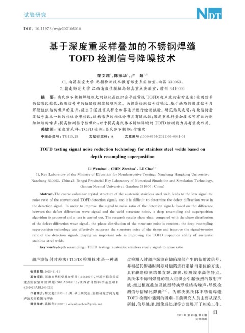 关键词:深度重采样; TOFD 检测; 奥氏体不锈钢; 信噪比