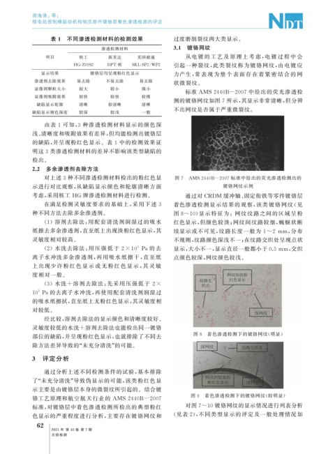 表 1 不同渗透检测材料的检测效果 过度磨削裂纹两大类显示。