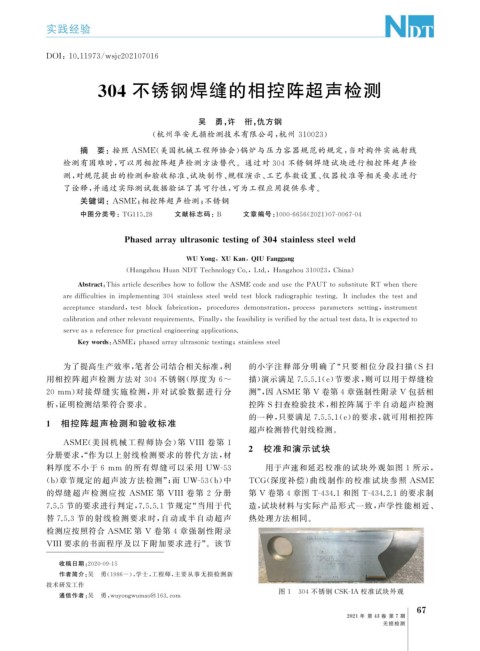 Ke ywords : ASME ; p hasedarra yultrasonictestin g ; stainlesssteel