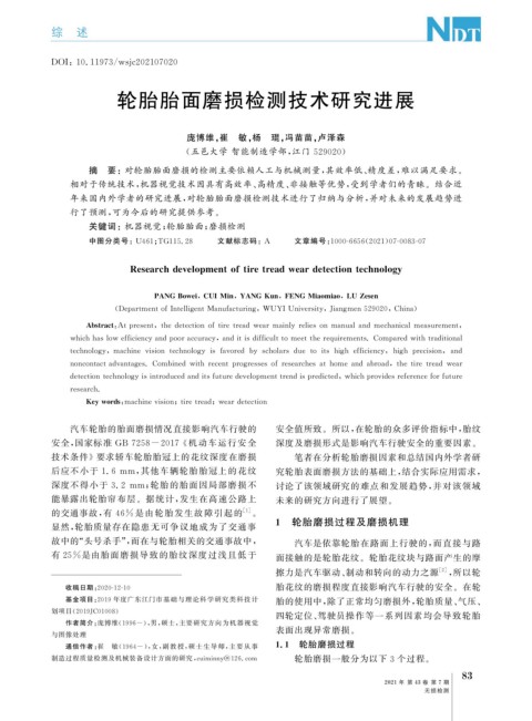 年来国内外学者的研究进展, 对轮胎胎面磨损检测技术进行了归纳与分析, 并对未来的发展趋势进