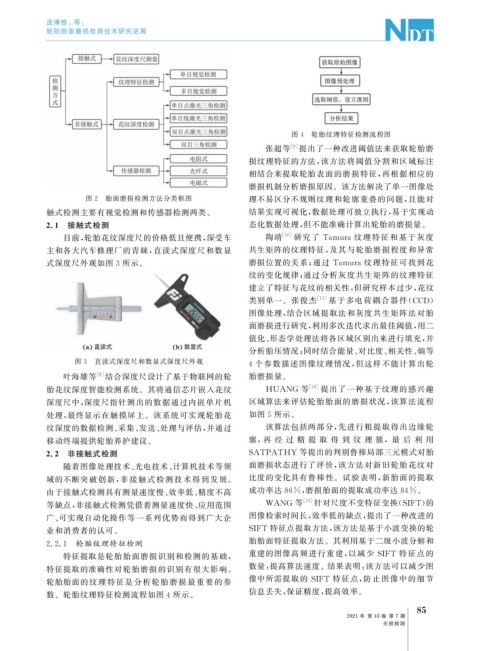 图 2 胎面磨损检测方法分类框图 理不易区分不规则纹理和轮廓重叠的问题, 且能对