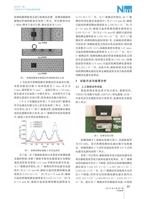 宽度或深度每增加 0.01 mm 导致的电 感变 化 量。 试件的曲线中存在3个峰值, 其所对应的检测线圈电