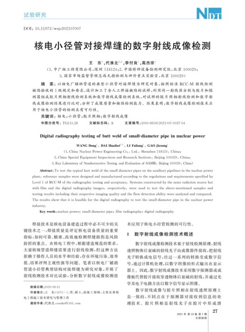 关键词:核电; 小径管; 胶片照相; 数字射线成像
