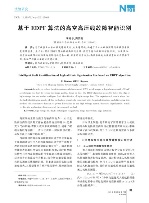 复图像质量。基于此, 利用 EDPF 算法检测高压线边缘, 实现了高压线故障智能识别。结果显示,