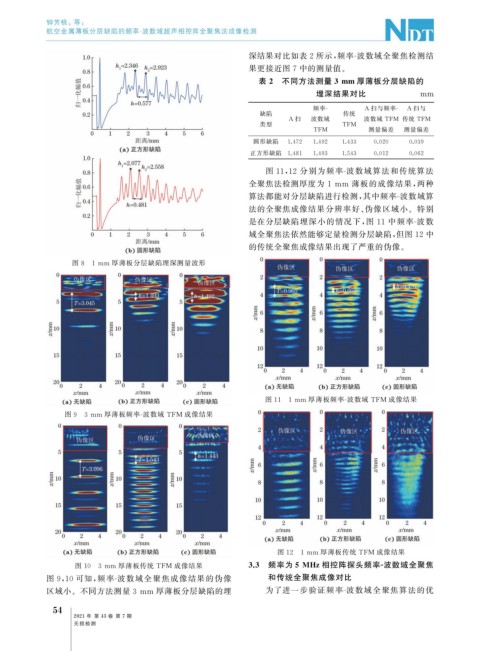 区域小。不同方法测量 3mm 厚薄板分层缺陷的埋 为了进一步验证频率 - 波数域全聚焦算法的优