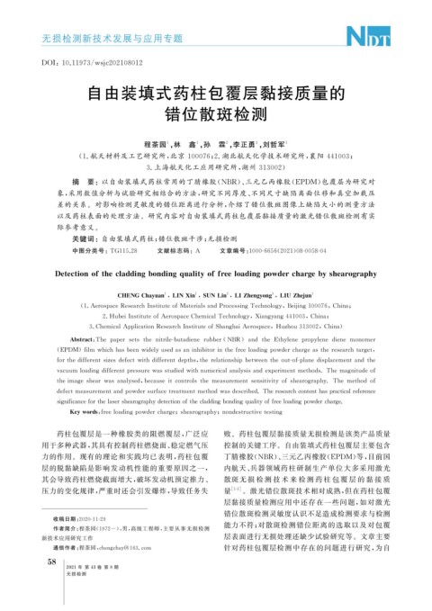 以及药柱表面的处理方法。研究内容对自由装填式药柱包覆层黏接质量的激光错位散斑检测有实