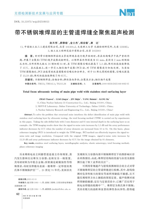 无损检测工作 核电站焊缝的检测中 [ 4-5 ] 。堆焊层为奥氏体不锈钢,
