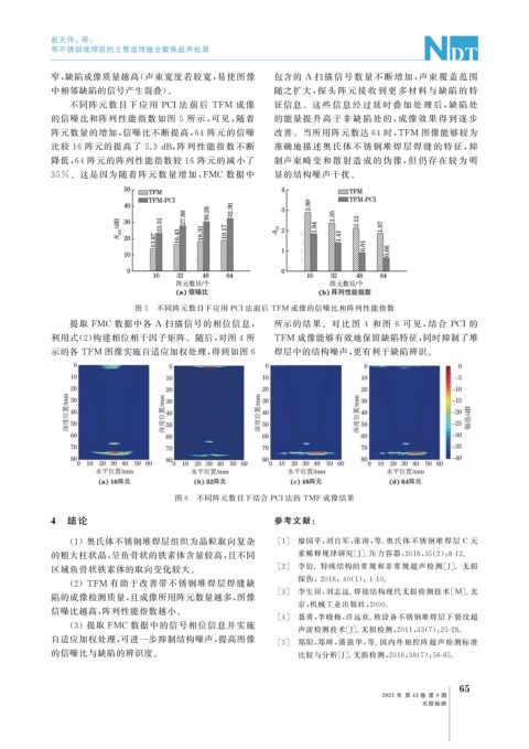 不同阵元 数 目 下 应 用 PCI法 前 后 TFM 成 像 征信息。这 些 信 息 经 过 延 时 叠 加 处 理 后, 缺 陷 处
