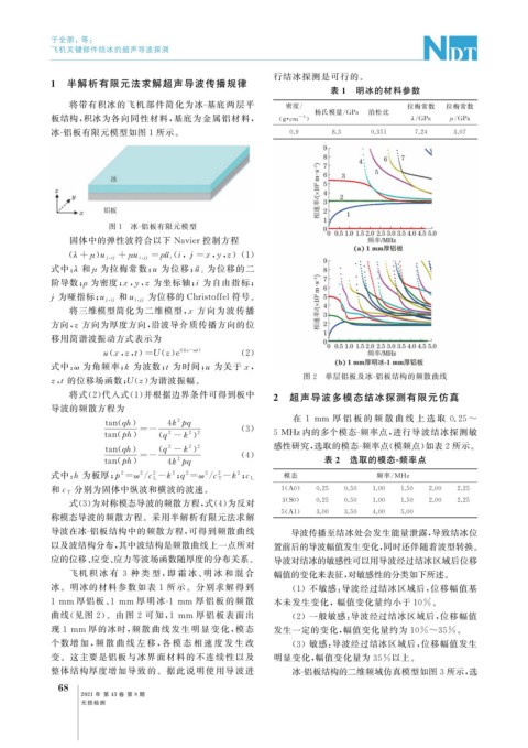 导波在冰 - 铝板结构中的频散方程, 可得到频散曲线 导波传播至结冰处会发生能量泄露, 导致结冰位