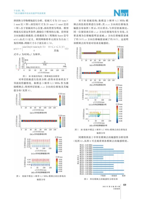 两端无反射边界条件, 激励位于模型的左端。沿厚度 同一位置结冰后的x , z 方向位移场均发生变化, 主